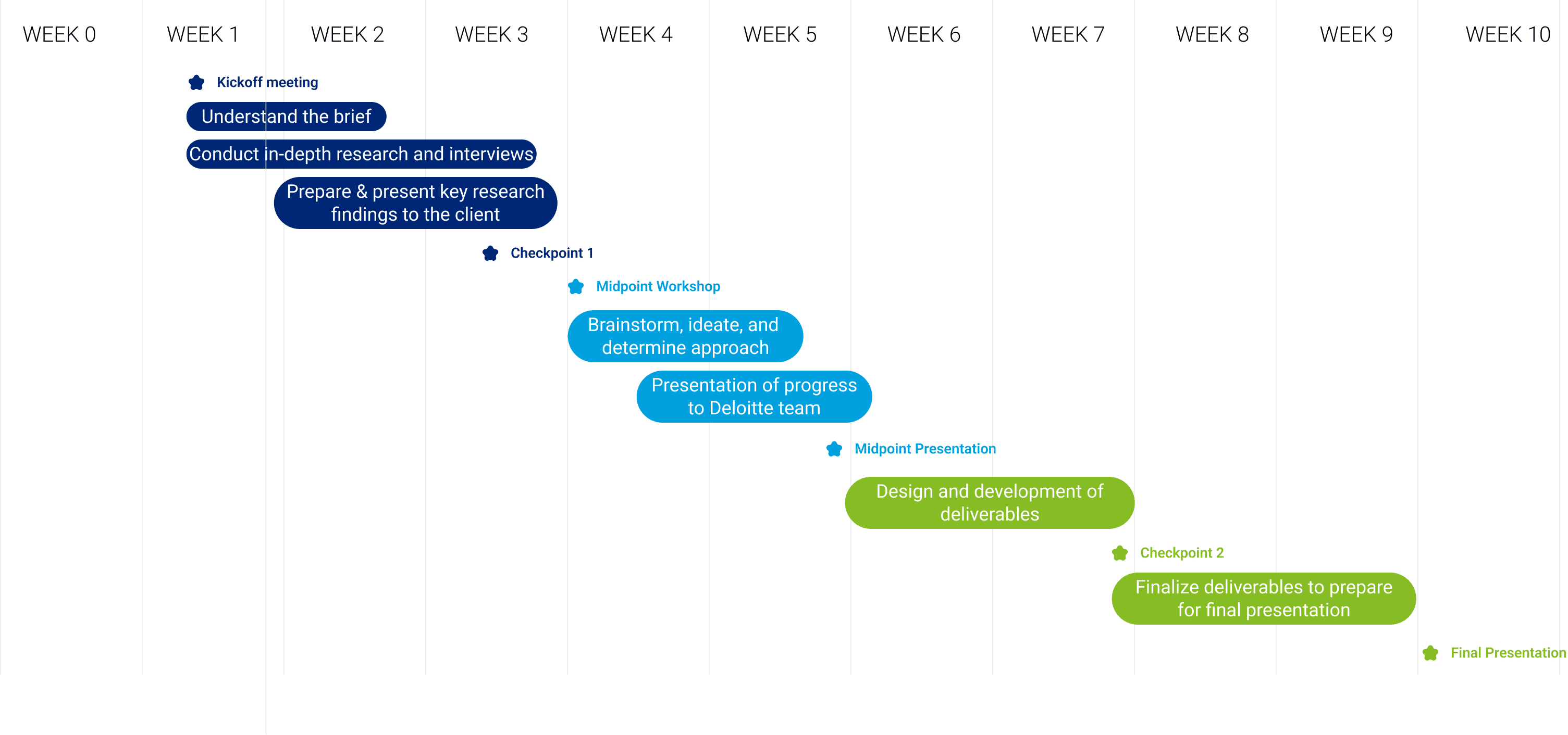 Phase 3 consisted of design and development of our deliverables, checkpoint presentation in week 7 and final presentation week 9.