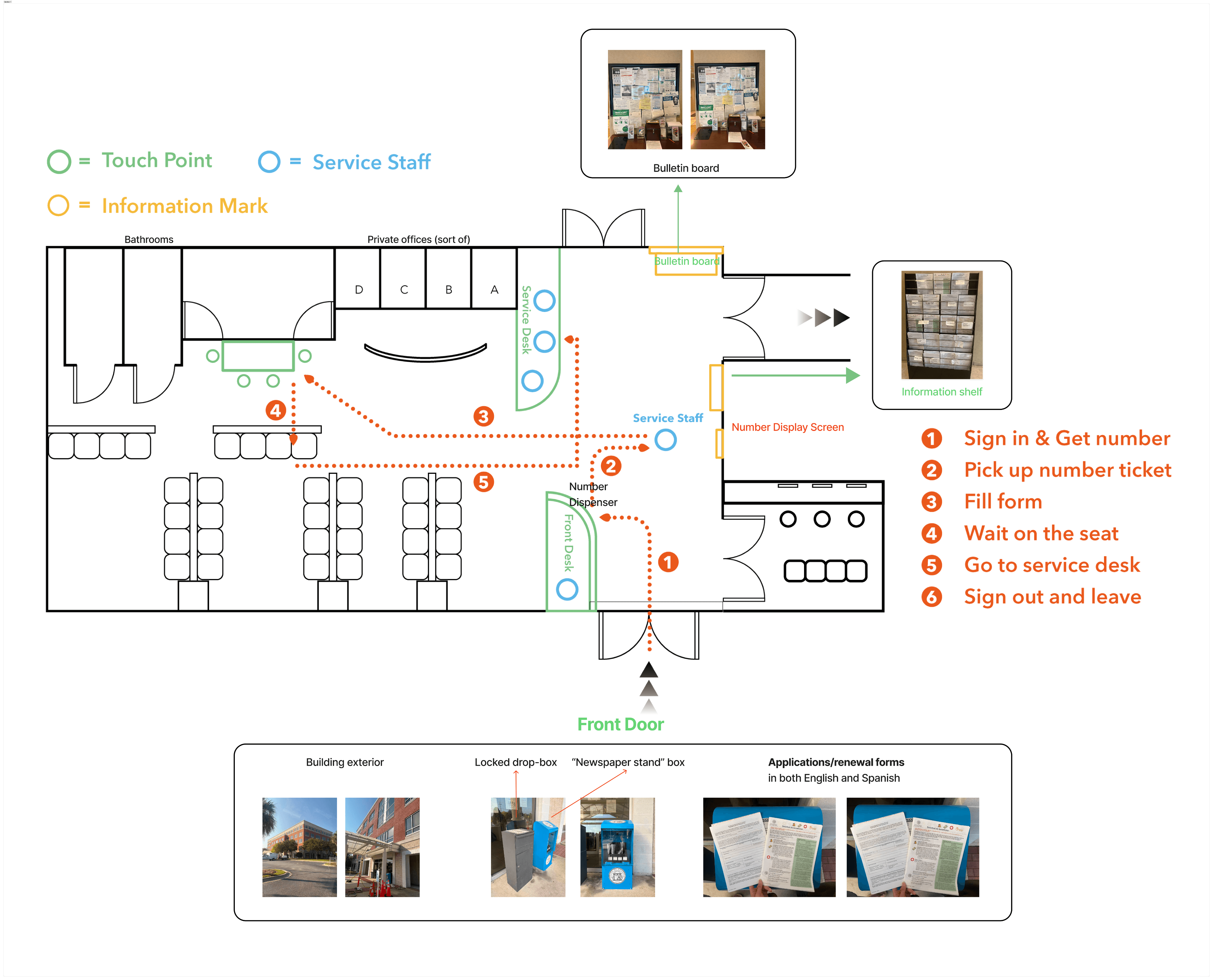 Help build a mock visual journey of a citizen walking into a medium-sized state office with all the recommendations for a modernized experience including physical layout for a model office with efficient traffic flow.