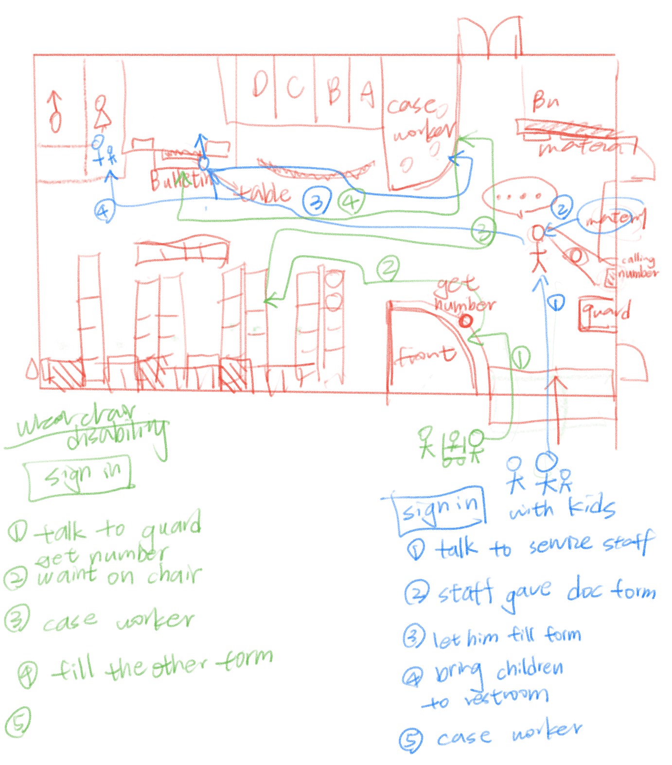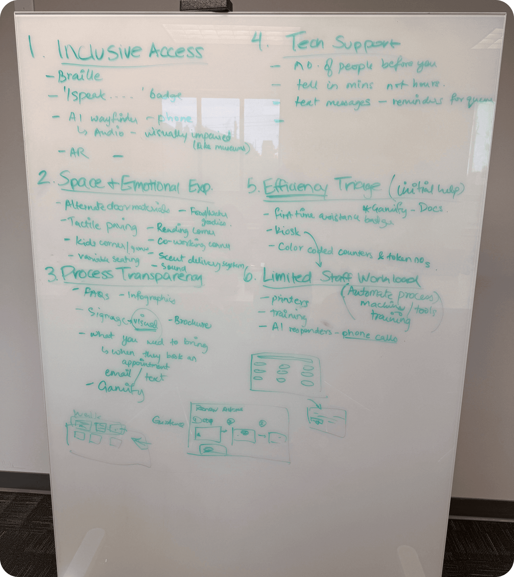 From these detailed notes, we extracted key observations and identified pain points to target with design solutions intended to improve the user journey and create a more unified and holistic lobby experience. These research findings provide the foundational insights guiding our redesign for the Kentucky HHS office lobby.