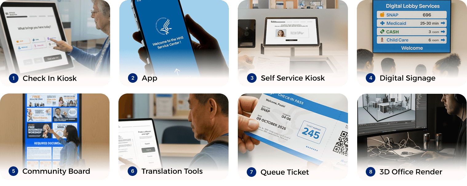 State Health and Human Services offices are essential access points for programs like SNAP, Medicaid, Cash Assistance, and unemployment support. However, long wait times, overloaded front desks, and language barriers for limited-English-proficiency clients reduce service efficiency and create a poor client experience.